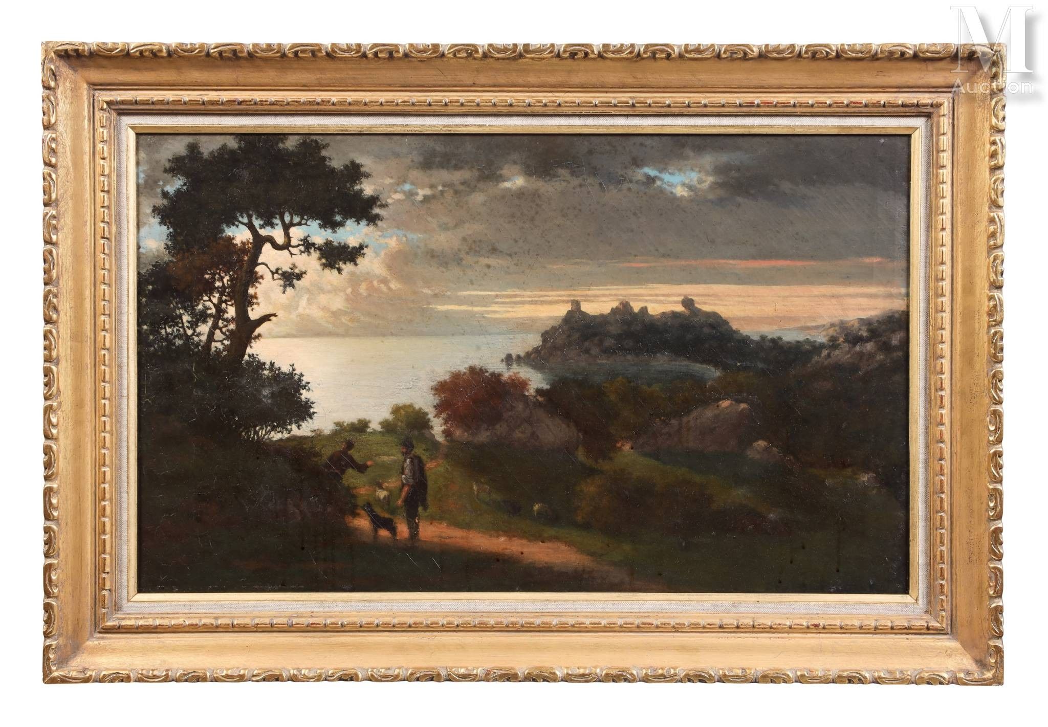 Ecole FRANCAISE du XXe siècle Promeneurs bord de mer avec un chien Huile sur toile 44 x 72 cm Trace de signature en bas à droite