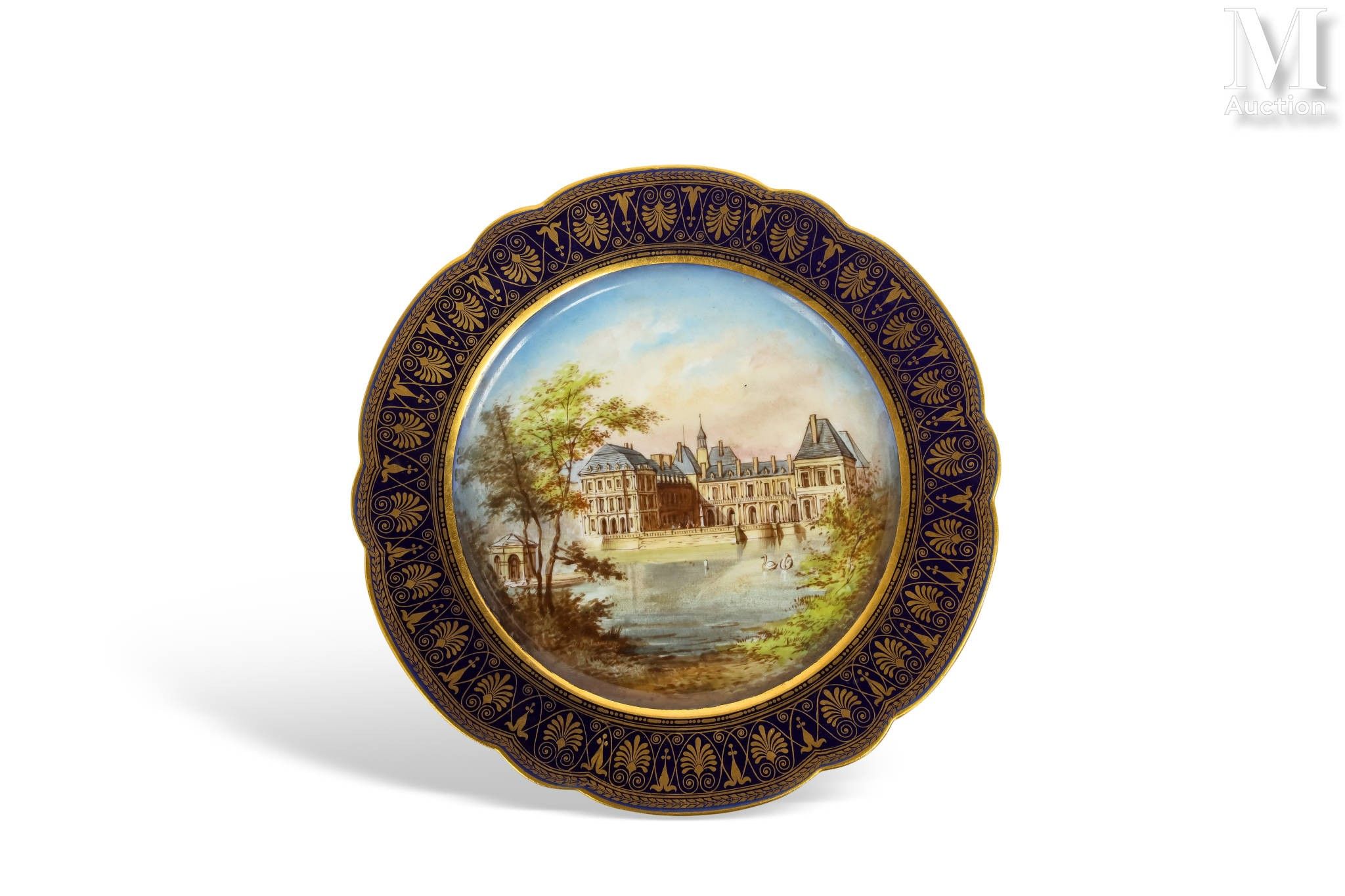 • Lot n° 210 SEVRES (dans le gout de) Assiette en porcelaine à contour polylobé, marli à fond bleu nuit sur lequel joue une frise de palmettes et de rinceaux stylisés dorés, le fond peint du château de Fontainebleau. Titré au dos Fontainebleau, marqué en rouge château des tuileries, marque bleue de Sèvres et une lettre date S 37 pour 1844. D. 22.5 cm. (usures sous la base)