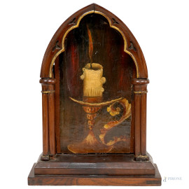Candela consunta, olio su tela applicata su cartone entro altarino votivo in legno, inizio XX secolo, misure totali cm 38,5x28,5x10, (difetti)