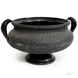 Vaso in ceramica con esterno a rifinitura grezza ed anse a foggia di collo di cigno, XX secolo, altezza cm 28,5, apertura diametro 35,5, (difetti)