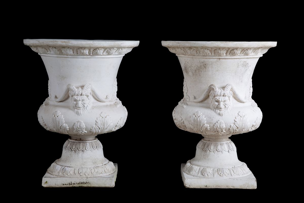 • Lot n° 0163 Coppia di vasi - Coppia di vasi in agglomerato di pietra decorati con motivi floreali e mascheroni. - 77x61 cm ca. -