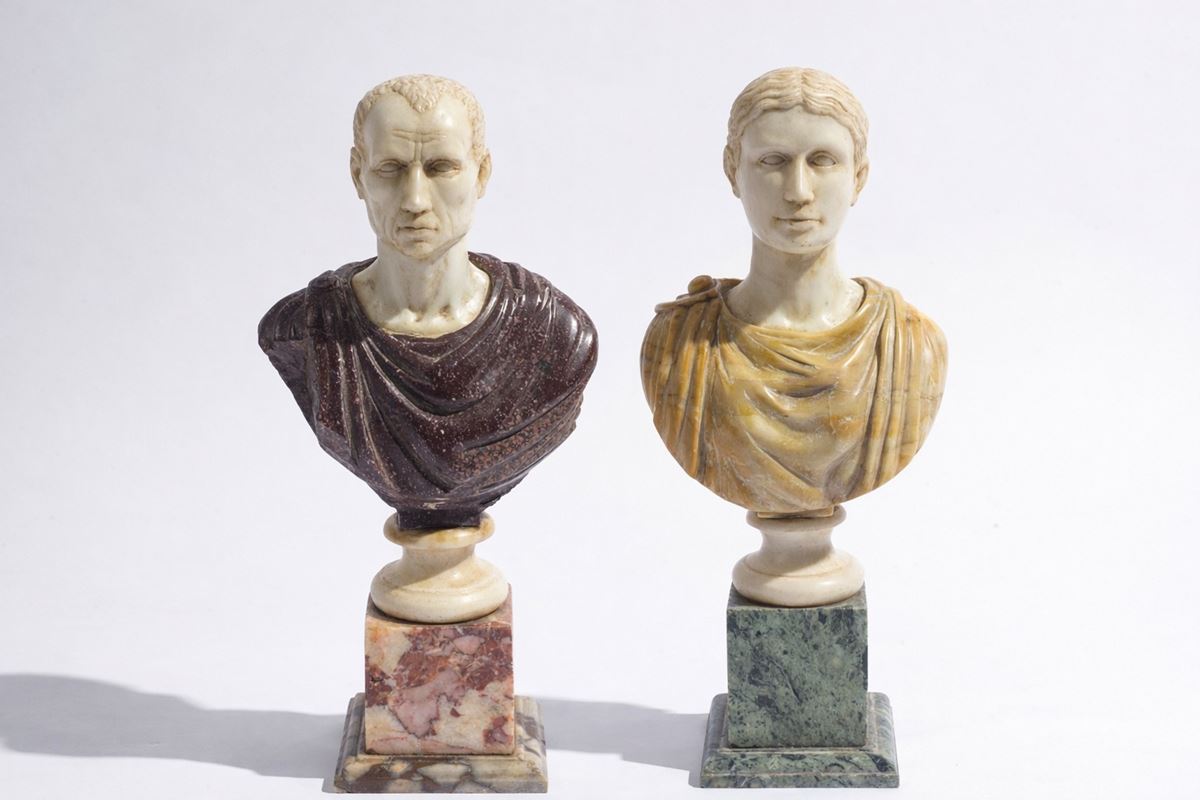 Coppia di sculture raffiguranti piccoli busti - Poggianti su basamenti a plinto. - Busto femminile: H. 34 cm / Busto maschile: H. 31 cm - marmi vari policromi
