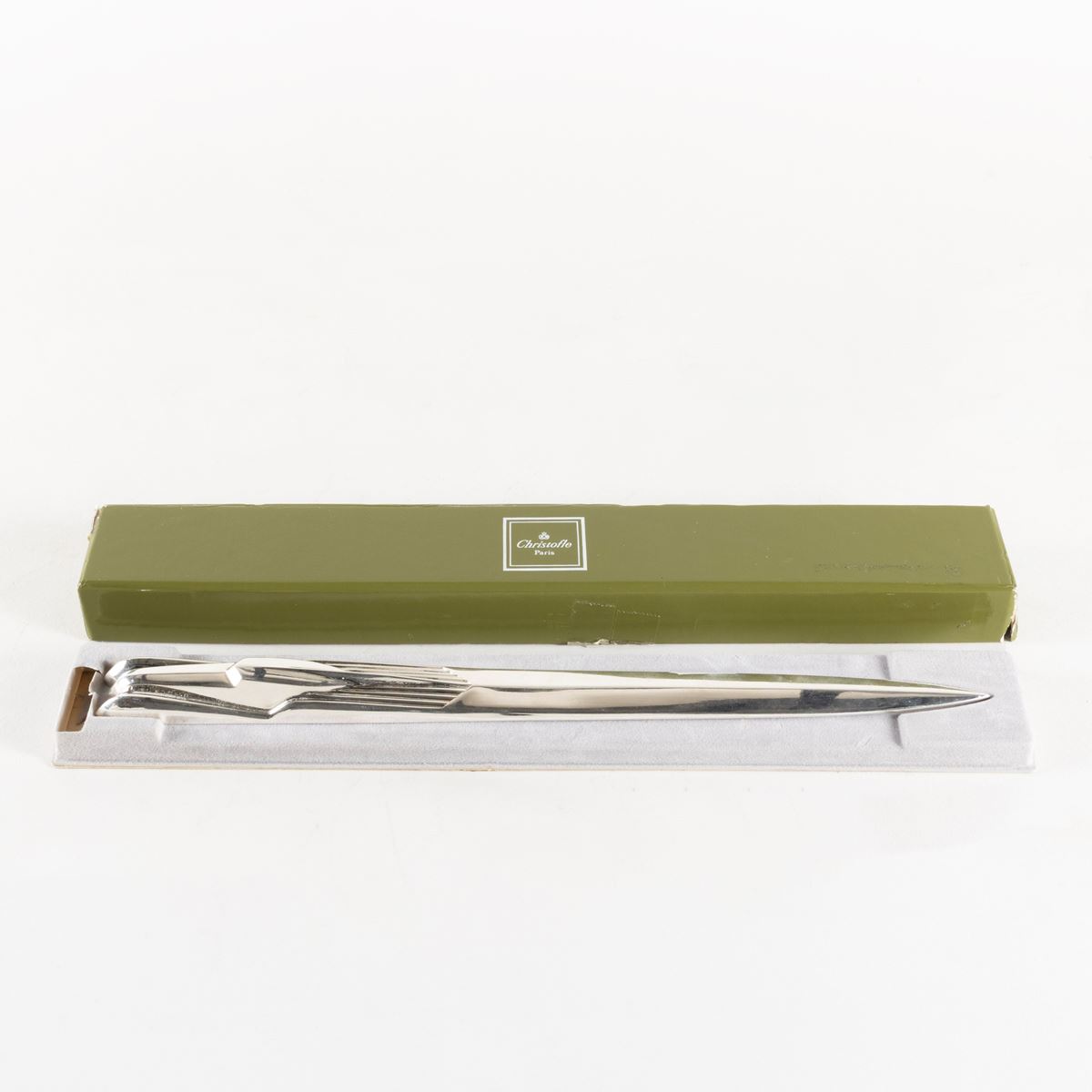• Lot n° 0135 Prod. Christofle - tagliacarte in metallo argentato, marchio della produzione, entro scatola originale, lievi usure - l. 30,5 cm. -