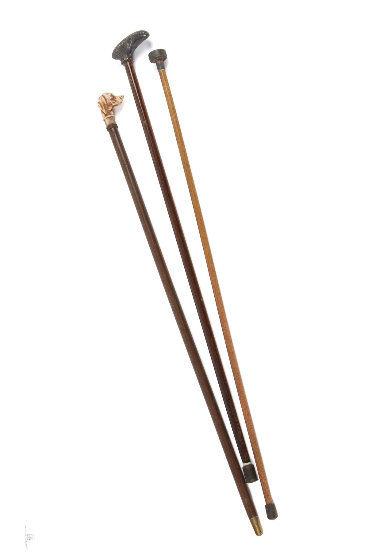 • Lot n° 0307 Tre bastoni con impugnature varie - Tre bastoni in legno con impugnature di varie forme e materiali. XX secolo. Difetti. - -