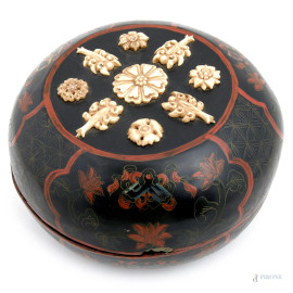 • Lot n° 0458 Cofanetto rotondo in papier mache con decorazioni nei toni del rosso e del nero con applicazioni al coperchio in resina, XX secolo, cm 12x20,5, (segni di usura)