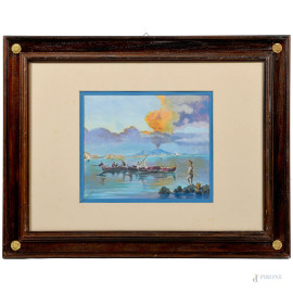 • Lot n° 0909 Golfo di Napoli con figure in costume, XX secolo, tecnica mista su carta, cm 58,5x53,5 compreso passepartout, firmato in basso a destra, entro cornice