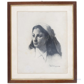 Ritratto di donna, XX secolo, gessetto e carboncino su su carta, cm 62,5x52,5 compreso passepartout, firmato in basso a destra, entro cornice (ondulazioni e tracce di umidità)