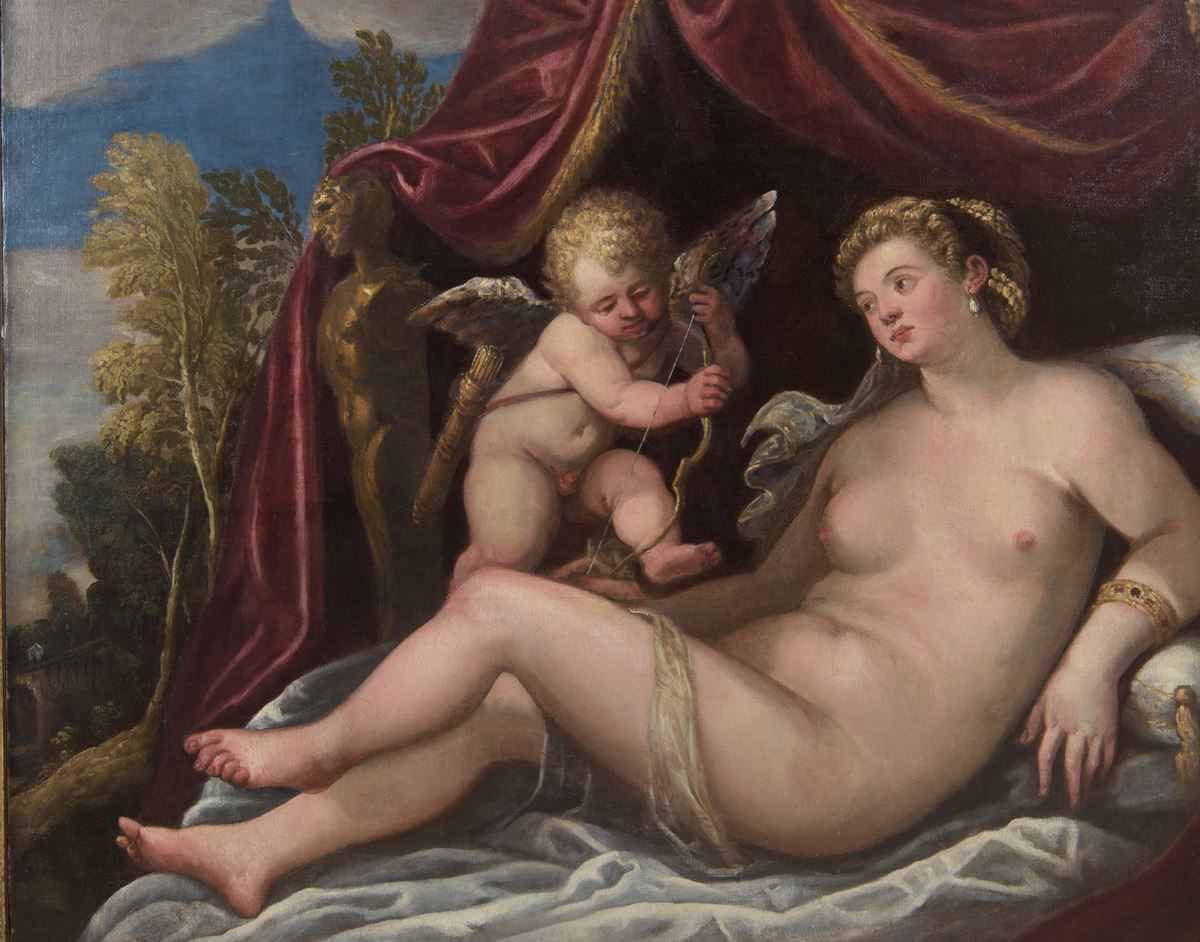 Venere e Cupido - La presente tela raffigura Venere distesa su un ricco letto coperto da morbidi drappi, il corpo nudo appena velato da un panneggio trasparente che ne esalta la luminosità dell’incarnato. Accanto a lei, Cupido è colto nell’atto di tendere l’arco, introducendo una nota di vivace dinamismo che anima la compostezza della figura femminile. La scena è ambientata in uno spazio di forte impianto teatrale, definito da un ampio tendaggio cremisi che incornicia la composizione e si apre su un brano di paesaggio, mentre due statue classiche emergono in penombra sullo sfondo, a sottolineare il raffinato richiamo all’antico.L’opera si colloca nella produzione della bottega veronesiana attiva dopo la morte di Paolo Veronese nel 1588, quando i figli Gabriele e Carlo Caliari continuarono l’attività paterna sotto la denominazione “Haeredes Pauli Caliari”. Sono evidenti i caratteri distintivi della tradizione del maestro: la sontuosità cromatica, dominata dai rossi profondi e dagli incarnati perlacei; l’eleganza idealizzata delle figure; l’ampio respiro scenografico della composizione. Rispetto alle opere autografe di Veronese, si riscontra una stesura più omogenea e una vibrazione luminosa più contenuta, elementi coerenti con la produzione di bottega tra la fine del XVI e l’inizio del XVII secolo.Il soggetto, particolarmente apprezzato dal collezionismo aristocratico europeo tra Cinquecento e Seicento, celebra l’unione allegorica tra Bellezza e Amore. La qualità decorativa dell’insieme, unita alla seducente resa del nudo e alla ricchezza dell’apparato scenico, rende il dipinto un significativo esempio della diffusione e della fortuna del linguaggio veronesiano in ambito collezionistico internazionale.Entro cornice dorata del XIX secolo. Provenienza: Collezione Italico Brass - 152 x 201 cm - Olio su tela