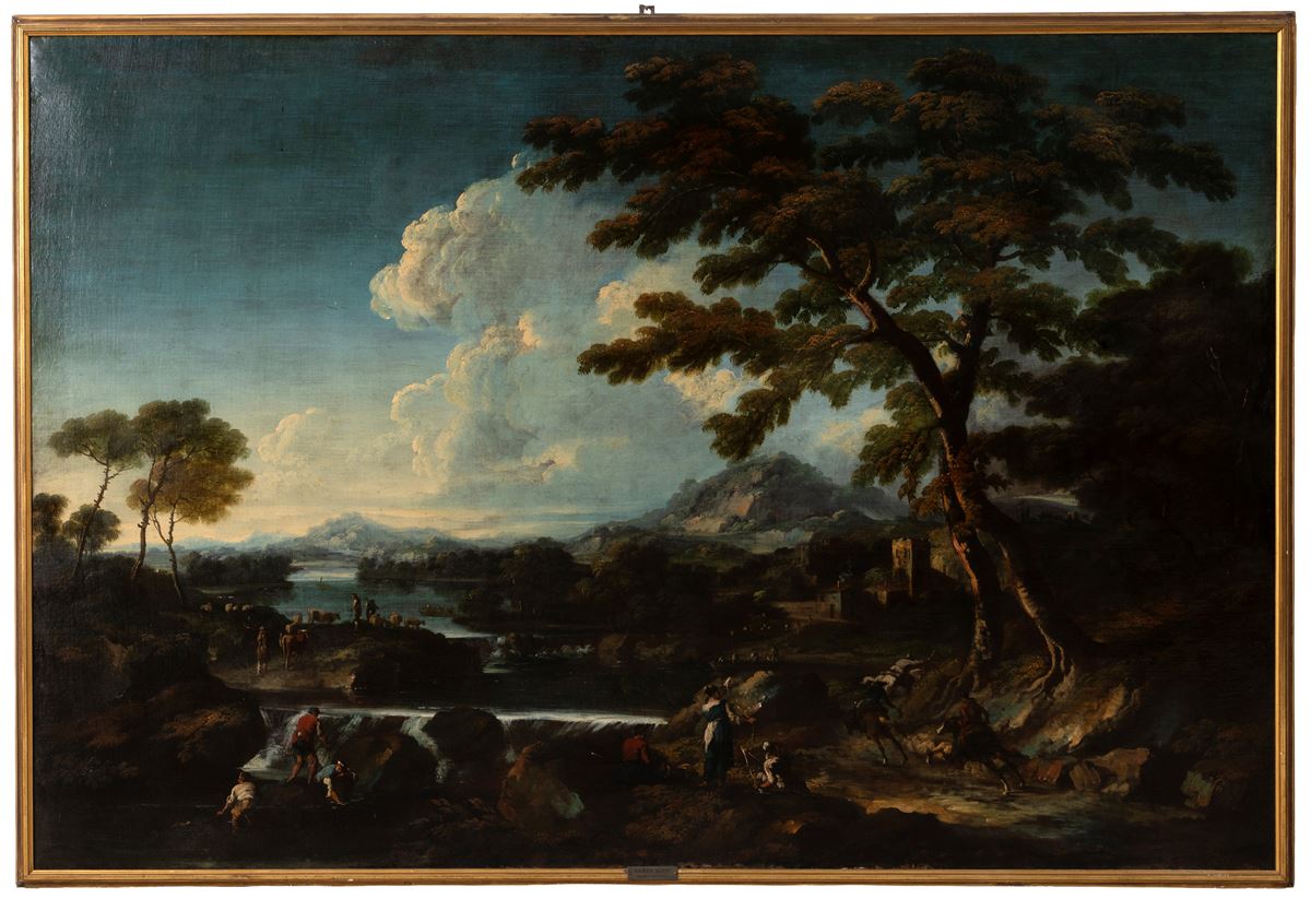 • Lot n° 0316 Dipinto "PAESAGGIO FLUVIALE CON SCENE DI VITA" - Dipinto olio su tela raffigurante "PAESAGGIO FLUVIALE CON SCENE DI VITA". Con autenticazione autografa di Giorgio Caretto (Perito d'Arte - Consulente Tecnico, Tribunale di Torino) datata 30.10.'59 sul retro. In cornice. Lievi restauri. - 118,5x154,5 cm ca. -