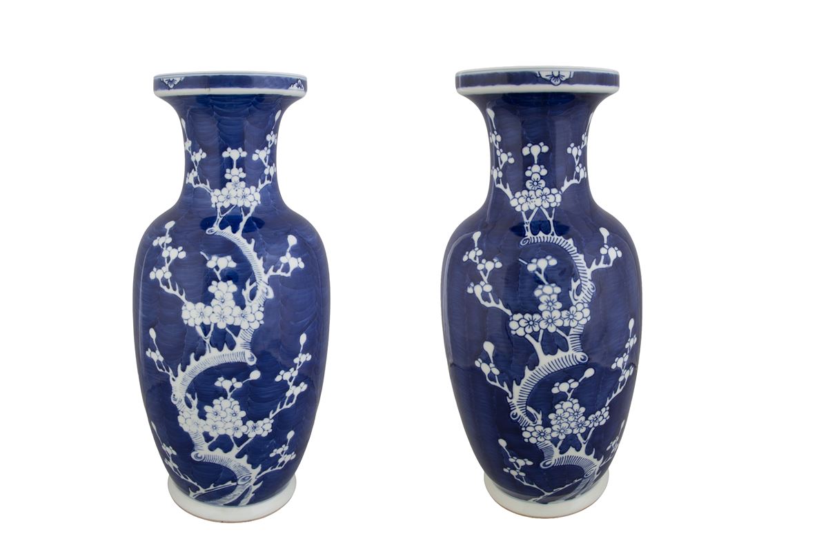 Coppia di vasi - Coppia di vasi in porcellana bianca e blu. Marcati sul fondo. Cina. - Alt. 46 cm ca. -