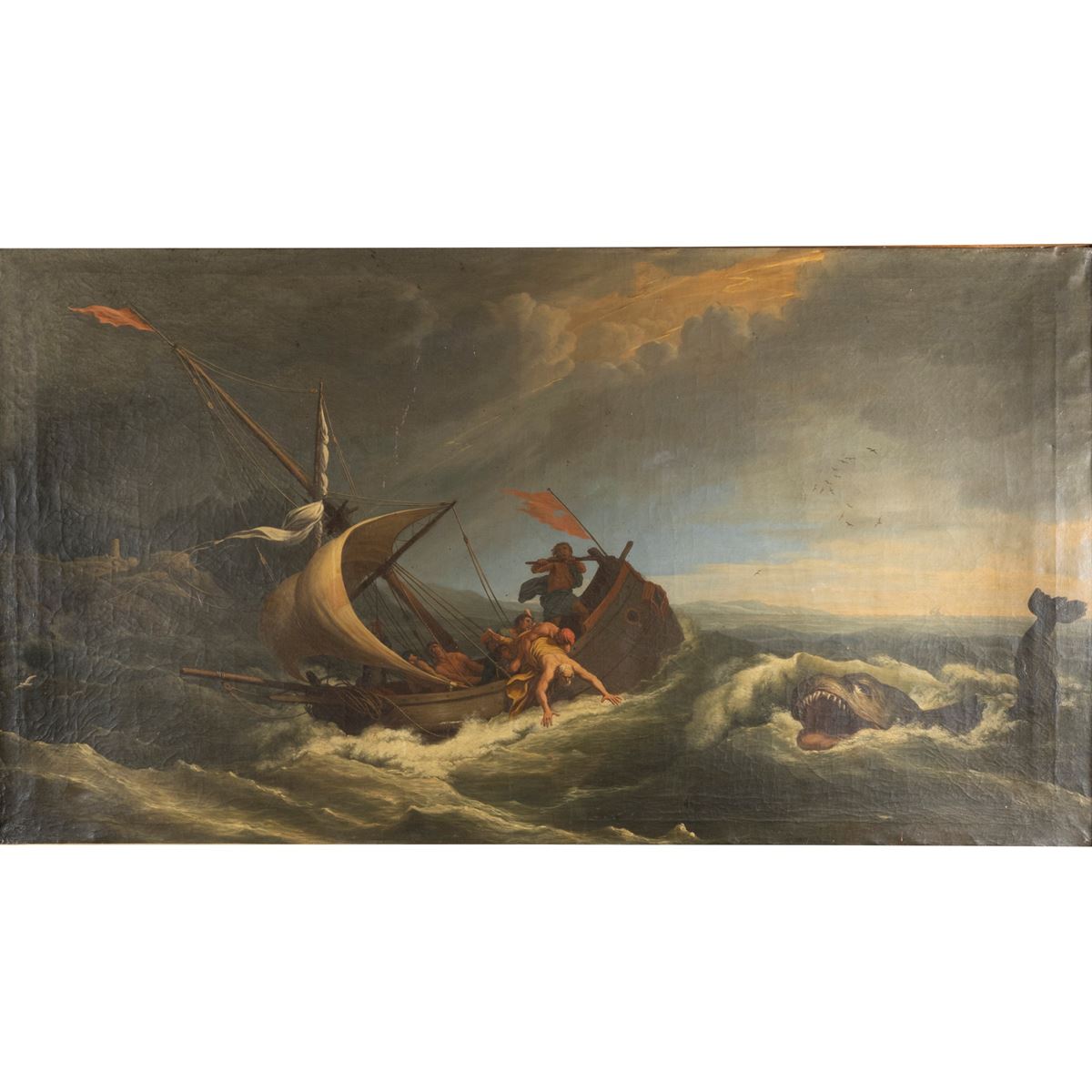 Scuola Francese - "Giona e la balena", olio su tela, entro cornice - 76x137,5 cm. -
