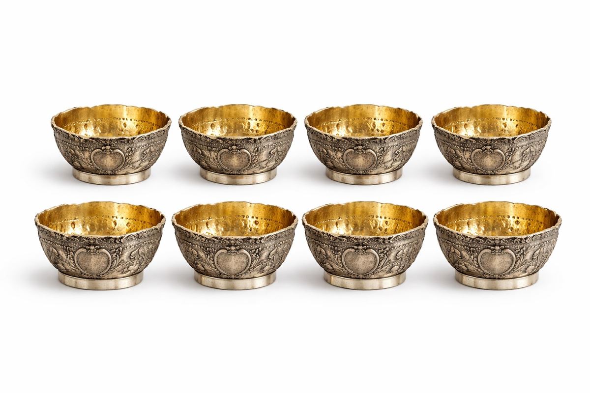 Otto ciotole in argento - con decorazioni a rilievo, Peso: 200 gr. ciascuna. I lotti oggetto della presente asta sono ubicati presso un’abitazione privata sita in Roma.La partecipazione all’asta implica la piena accettazione della condizione secondo cui il ritiro dei beni aggiudicati sarà interamente a cura, rischio e spese dell’aggiudicatario.Resta inteso che eventuali operazioni di smontaggio, imballaggio, trasporto e ritiro dovranno essere organizzate direttamente dall’aggiudicatario.Si raccomanda pertanto di richiedere preventivamente tutte le informazioni necessarie, anche al fine di acquisire eventuali preventivi per il trasporto prima di formulare un’offerta. - -