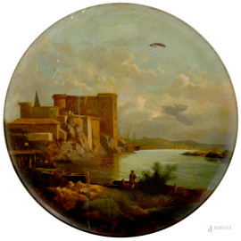 Grande piatto in maiolica dipinta raffigurante scorcio di città sulla riva di un lago con pescatori, firmato in basso, XX secolo, diametro cm 44,5, (difetti)