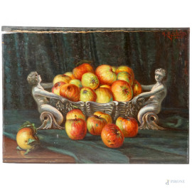 • Lot n° 0349 Natura morta con mele in fruttiera con tritoni, firmato e datato "M. Giubilei 1935" in alto a destra, entro cornice, (difetti e rotture)