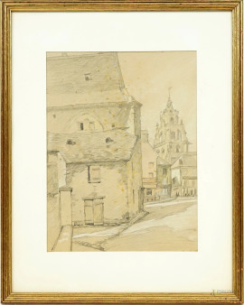 • Lot n° 0893 Scorcio di città, disegno a tecnica mista su carta, cm 26,5x20 circa, XX secolo, entro cornice.
