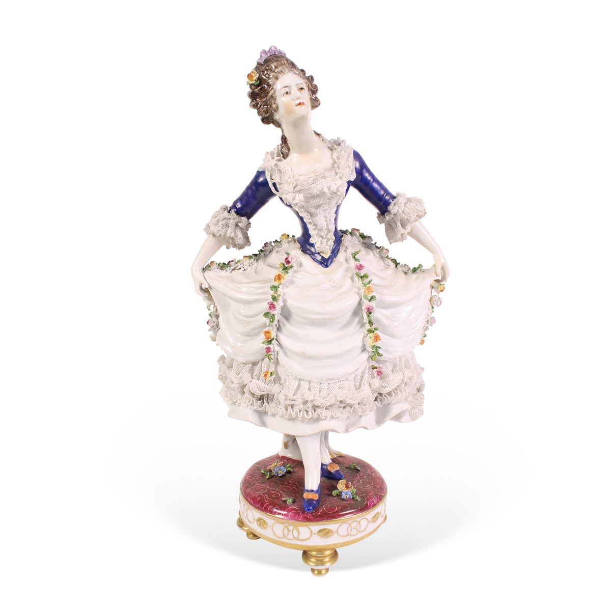 Manifattura Volkstedt - scultura in ceramica smaltata raffigurante una nobildonna, marchio di produzione, difetti. - h. 31 cm -