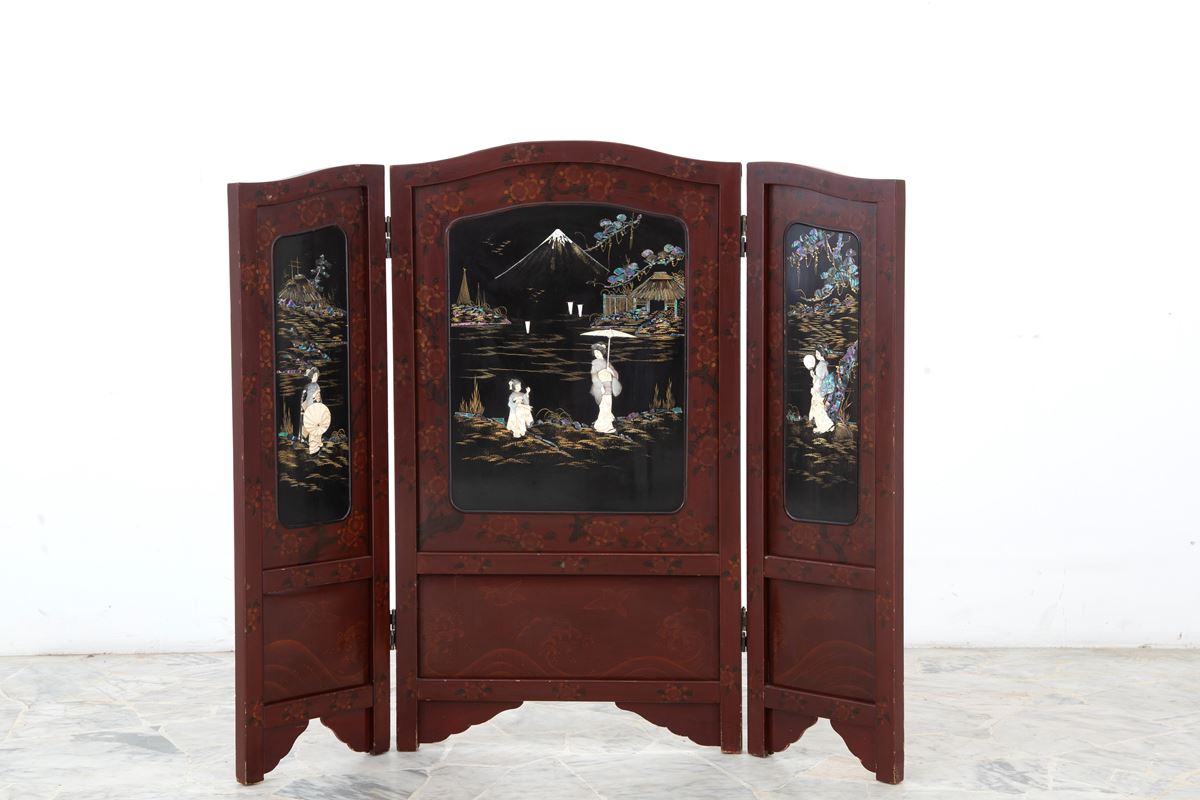 Piccolo paravento - Piccolo paravento in legno laccato decorato in lacca Coromandel con scene di vita orientale in madreperla e osso. Cina. Inizi XX secolo. Lievi difetti.Misure da chiuso: 92x52 cm ca.Misure da aperto: 104x92 cm ca. - -