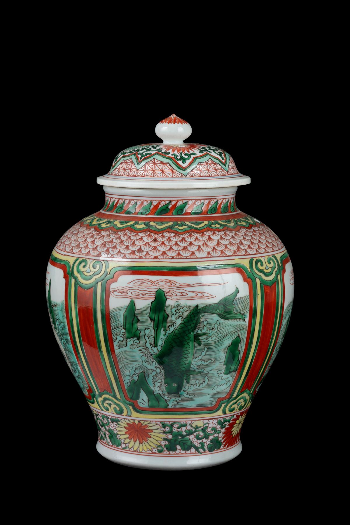 Potiche in porcellana - Potiche in porcellana decorata con pesci entro riserve. Cina. XX secolo. - 34x27 cm ca. -