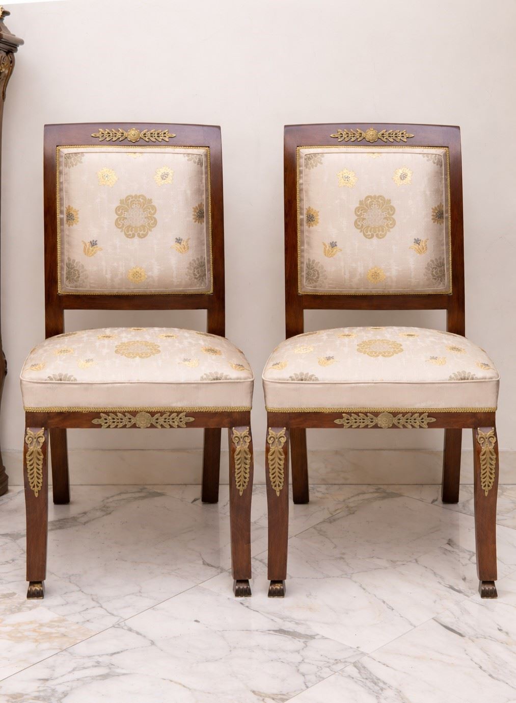 • Lot n° 0244 Coppia di sedie in stile Impero - In legno con applicazioni in bronzo. Rivestimento in tessuto in ottime condizioni. I lotti oggetto della presente asta sono ubicati presso un’abitazione privata sita in Roma.La partecipazione all’asta implica la piena accettazione della condizione secondo cui il ritiro dei beni aggiudicati sarà interamente a cura, rischio e spese dell’aggiudicatario.Resta inteso che eventuali operazioni di smontaggio, imballaggio, trasporto e ritiro dovranno essere organizzate direttamente dall’aggiudicatario.Si raccomanda pertanto di richiedere preventivamente tutte le informazioni necessarie, anche al fine di acquisire eventuali preventivi per il trasporto prima di formulare un’offerta. - 105 x 57 x 60 cm -
