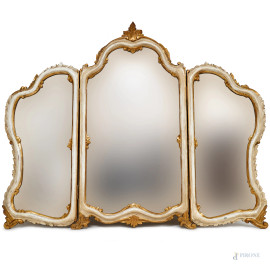 Specchio a tre ante in legno intagliato e laccato bianco e oro, verso rivestito in tessuto panna, cm 67,5x86 (difetti)