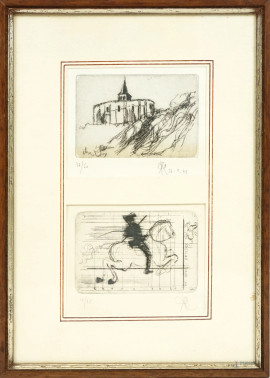 • Lot n° 1012 Due incisioni raffiguranti la chiesa di Saint-Pierre de Chateloy e un cavaliere a cavallo, monogrammati e datati, cm 27,2x19,2 compresa cornice