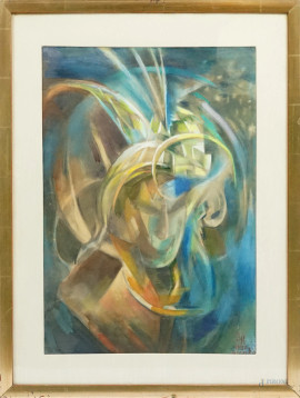 • Lot n° 0715 Senza titolo, tecnica mista su carta, cm 58x40,5, firmato e datato, entro corncie
