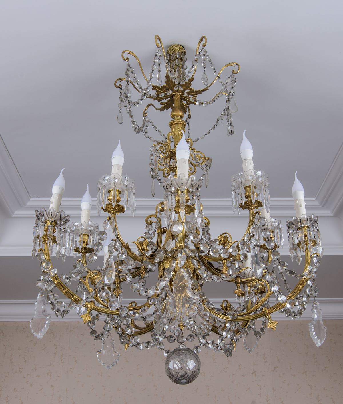 Imponente lampadario - a 9 bracci, in bronzo dorato e cristallo, caratterizzato da struttura mossa a bracci riccamente decorati e da pendenti in cristallo sfaccettato.Il corpo centrale è impreziosito da cascate di gocce e festoni di cristallo, culminanti in finale a sferaI lotti oggetto della presente asta sono ubicati presso un’abitazione privata sita in Roma.La partecipazione all’asta implica la piena accettazione della condizione secondo cui il ritiro dei beni aggiudicati sarà interamente a cura, rischio e spese dell’aggiudicatario.Resta inteso che eventuali operazioni di smontaggio, imballaggio, trasporto e ritiro dovranno essere organizzate direttamente dall’aggiudicatario.Si raccomanda pertanto di richiedere preventivamente tutte le informazioni necessarie, anche al fine di acquisire eventuali preventivi per il trasporto prima di formulare un’offerta. - H. 120 x D. 70 cm -