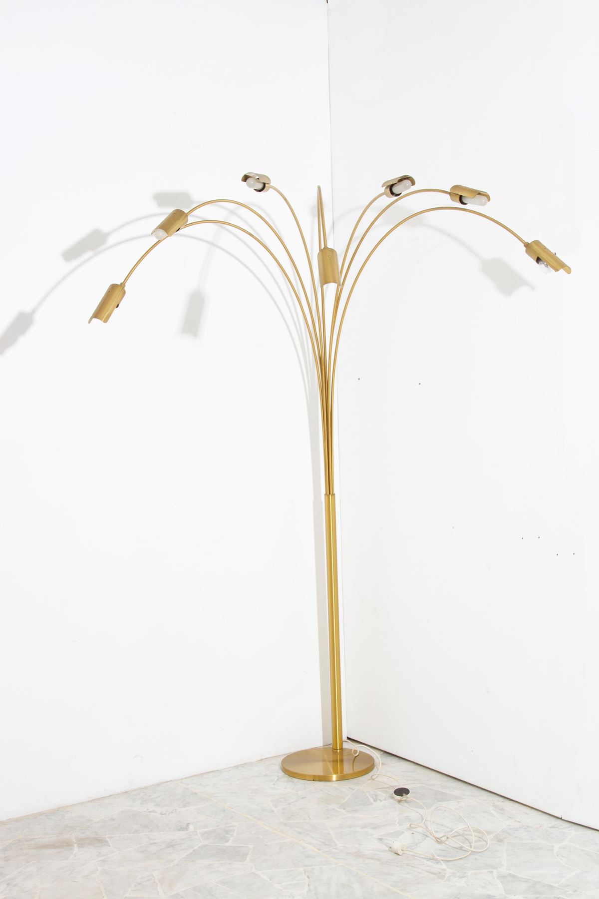• Lot n° 0469 Lampada da terra in ottone - Lampada da terra sette luci ad arco in ottone. Anni '70. Segni di usura del tempo. - 215x160 cm ca. -