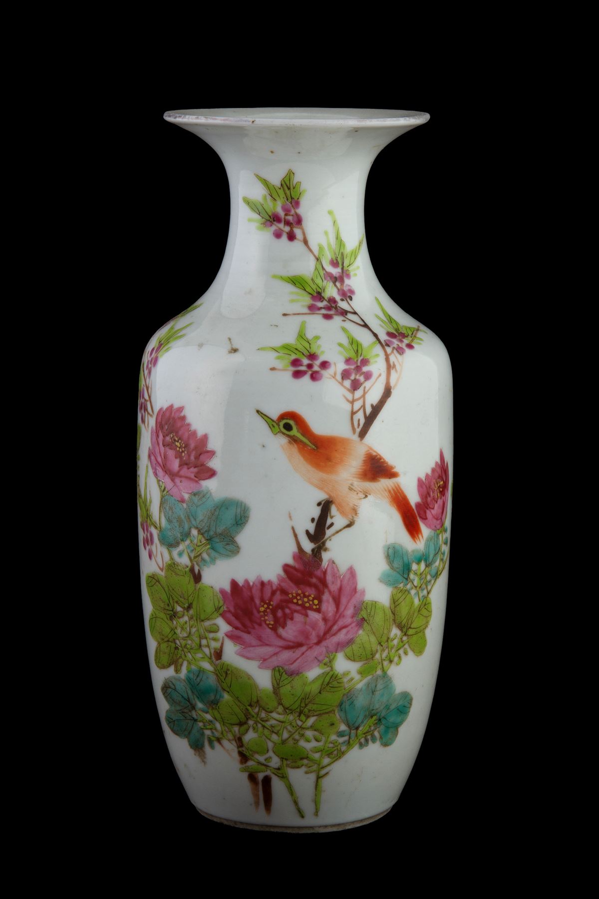 • Lot n° 0011 Vasetto - Vasetto in porcellana con decori floreali e scritte. Cina. - 23x11 cm ca. -