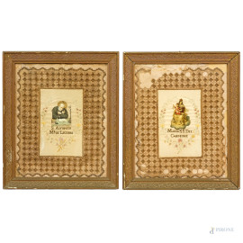 Lotto di due tessuti ricamati e stampati rappresentanti Sant'Alfonso Maria de Liguori e Santa Maria del Carmine, XX secolo, cm 54x43,5 circa, entro cornice