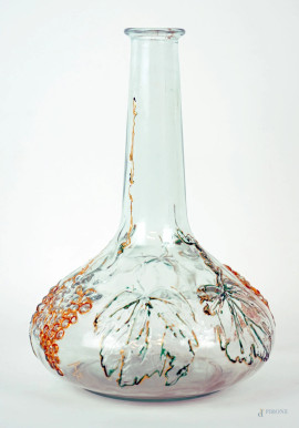 Vaso in vetro con decoro di grappoli d'uva, dettagli policromi verdi e dorati, cm h 24, XX secolo.