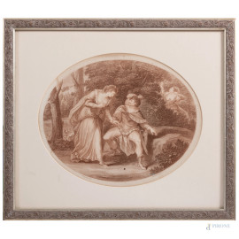 Francesco Bartolozzi,(1728 - 1815), Acquaforte da G.B. Cipriani, bulino e maniera punteggiata a color seppia, cm 39,5x46 compreso passepartout, entro cornice, (lievi segni di usura e tracce di umidità)