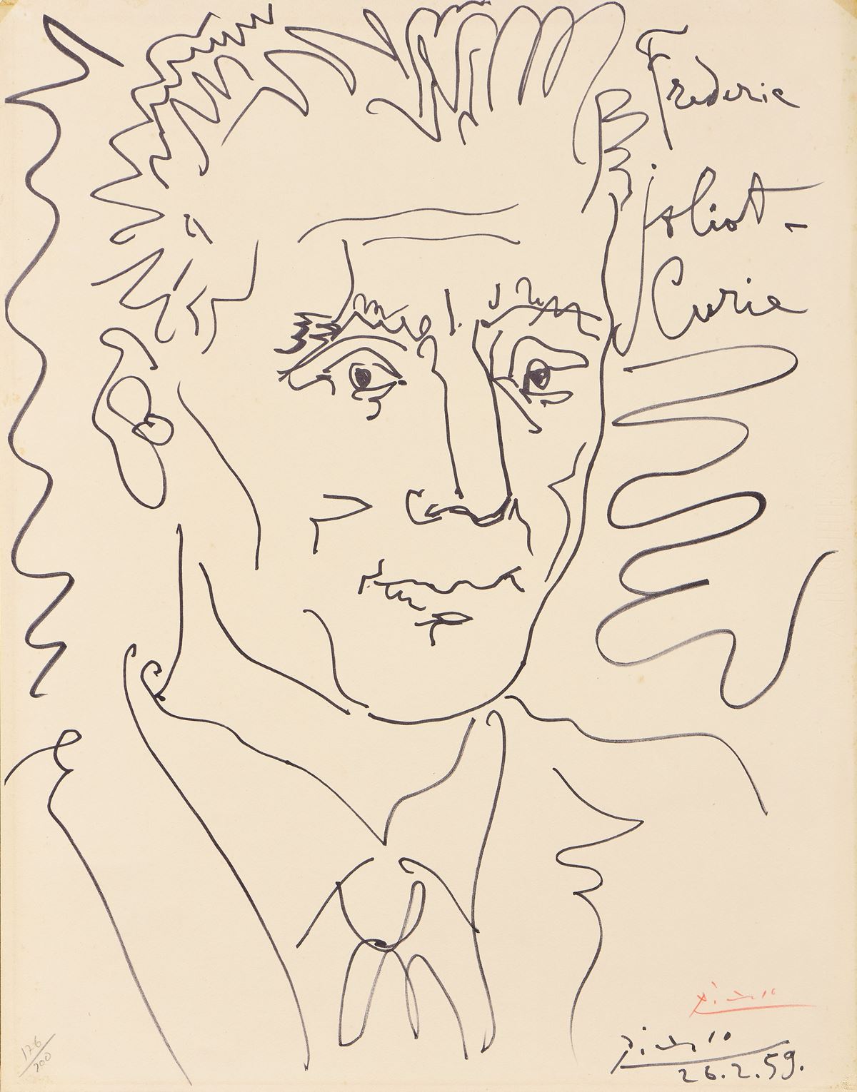 • Lot n° 0515 Hommage à F. Joliot-Curie - Firma e data in lastra in basso a destra: Picasso / 26.2.59, firma a matita in basso a destra: Picasso, timbro a secco Libreria Prandi, Reggio, tiratura in basso a sinistra: 176/200. - cm 65,7x52 (carta) - Stampa offset su carta, es. 176/200