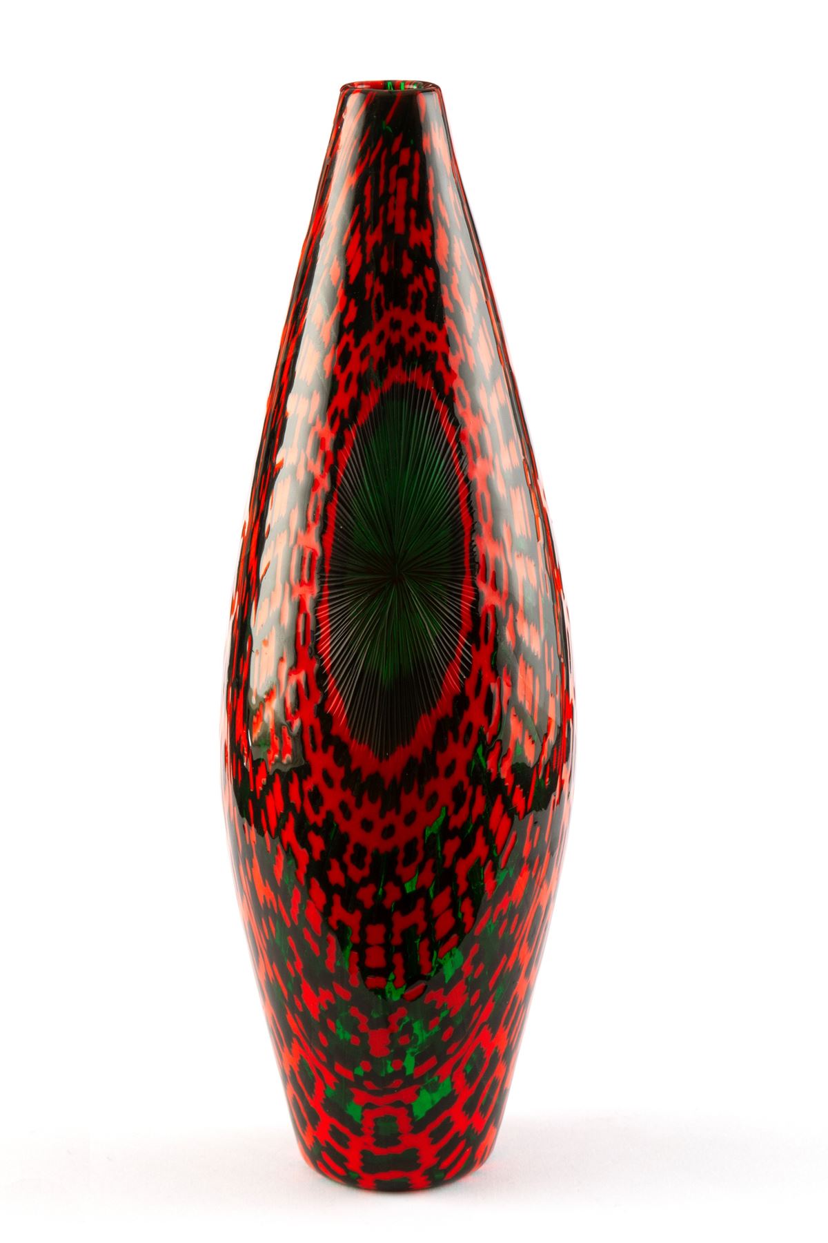 Vaso Caleidos - Vaso Caleidos in vetro di Murano con decoro rosso e verde a motivo caleidoscopico. Firmato, datato 2010 e numero di esemplare 1/1 sul fondo. - Alt. 37,5 cm ca. -
