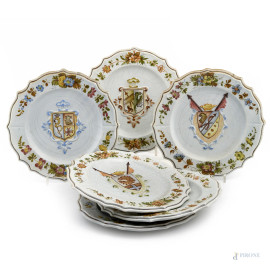 Lotto composto da 6 piatti in ceramica decorati in policromia a motivi floreali e stemmi araldici a rilievo al cavetto, XX secolo, diametro cm 24,5, (segni di usutra, scalfiture)