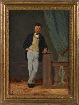Ritratto di giovane gentiluomo, olio su tela, XX secolo, cm 46,5x33,5 firmato in basso a sinistra, entro cornice, (piccolissime cadute di colore e foro in basso)