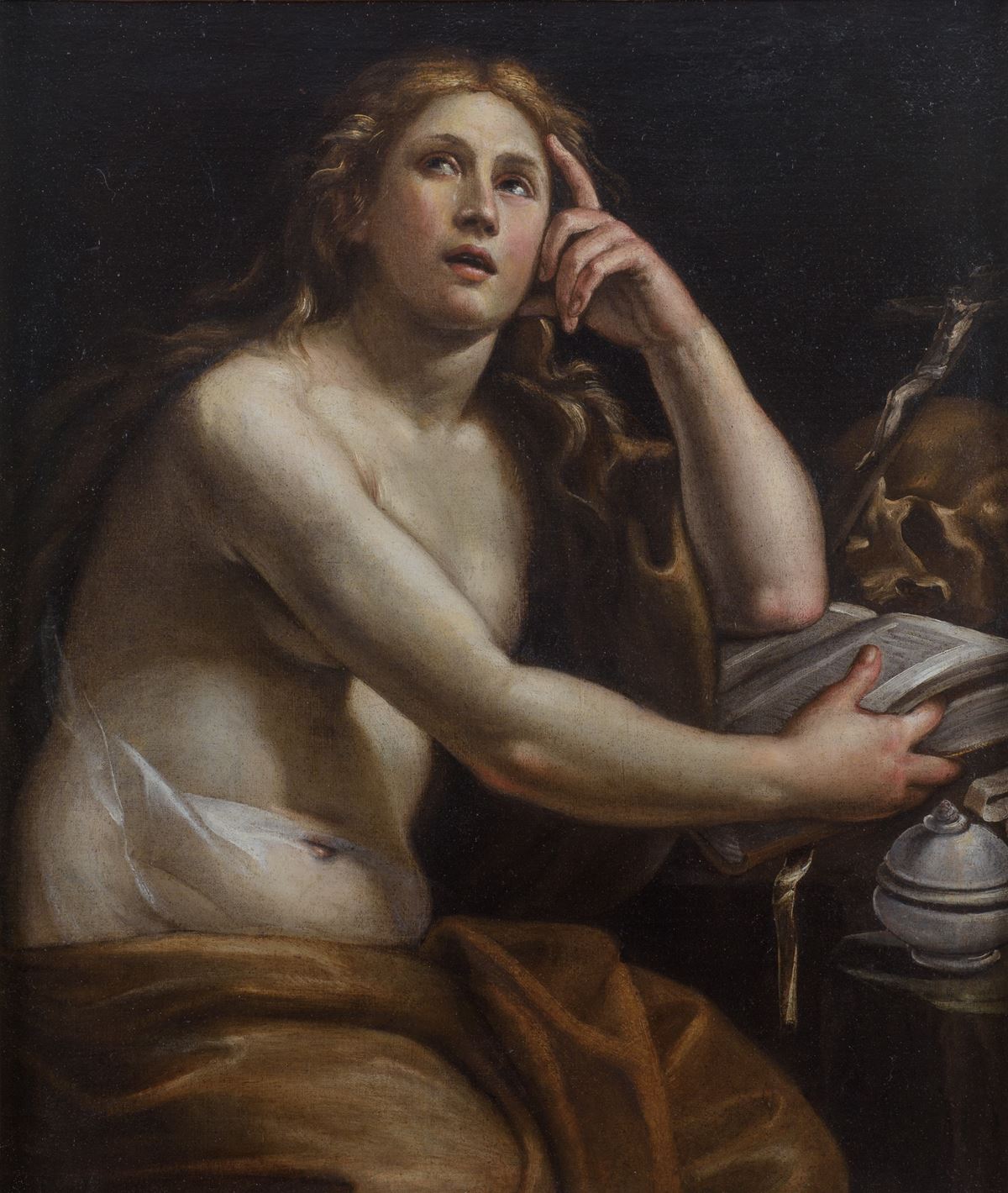 • Lot n° 0155 Maria Maddalena penitente - L’opera, inedita, è attribuita al maestro veronese sulla base di considerazioni stilistiche condivise da Pierluigi Carofano, Emilio Negro e Nicosetta Roio. Si colloca verosimilmente nella fase matura della sua attività, intorno al 1638, quando l’artista, attivo a Roma, aderisce al linguaggio classicista promosso in ambito barberiniano.La composizione presenta la santa a mezzo busto, seduta nella grotta del suo ritiro eremitico, colta in un momento di intensa meditazione. Il corpo, parzialmente scoperto e avvolto da un drappo rosso, è costruito con saldo impianto plastico e una resa morbida e luminosa dell’incarnato. La figura poggia il capo sulla mano sinistra mentre lo sguardo, umido e rivolto verso l’alto, enfatizza la dimensione penitenziale e contemplativa. Attorno si dispongono gli attributi iconografici consueti: il teschio, allusione alla vanitas e alla meditazione sulla morte; il libro sacro, segno di studio e raccoglimento; il crocifisso, oggetto di devozione; e il vaso di unguenti, riferimento all’episodio evangelico della sepoltura di Cristo. L’insieme costruisce un programma simbolico coerente centrato sul tema della conversione e della rinuncia alla vanità terrena.Dal punto di vista stilistico, l’opera rivela una chiara adesione a modelli classicisti, con evidenti consonanze con la pittura di Guido Reni, Guercino e Domenichino, nella ricerca di equilibrio formale, nella purezza del disegno e nella nobilitazione del nudo, trattato con una sensualità controllata e idealizzata piuttosto che naturalistica. Il modellato morbido, la luce calda e dorata e la compostezza dell’impianto figurativo confermano l’inserimento dell’opera nel clima della cultura figurativa romana del secondo quarto del Seicento, mediata attraverso la sintesi tra tradizione emiliana e suggestioni fiorentine.Il confronto con opere come la Cleopatra morente (Roma, collezione privata) e la Santa Cecilia (già Praga, mercato antiquario) rafforza l’attribuzione, evidenziando analogie nella costruzione anatomica, nella tipologia dei volti e nella qualità del disegno.Entro cornice coeva.L'opera è accompagnata da expertise del Prof. Pierluigi Carofano datata 31 marzo 2026. - 95 x 80 cm - olio su tela