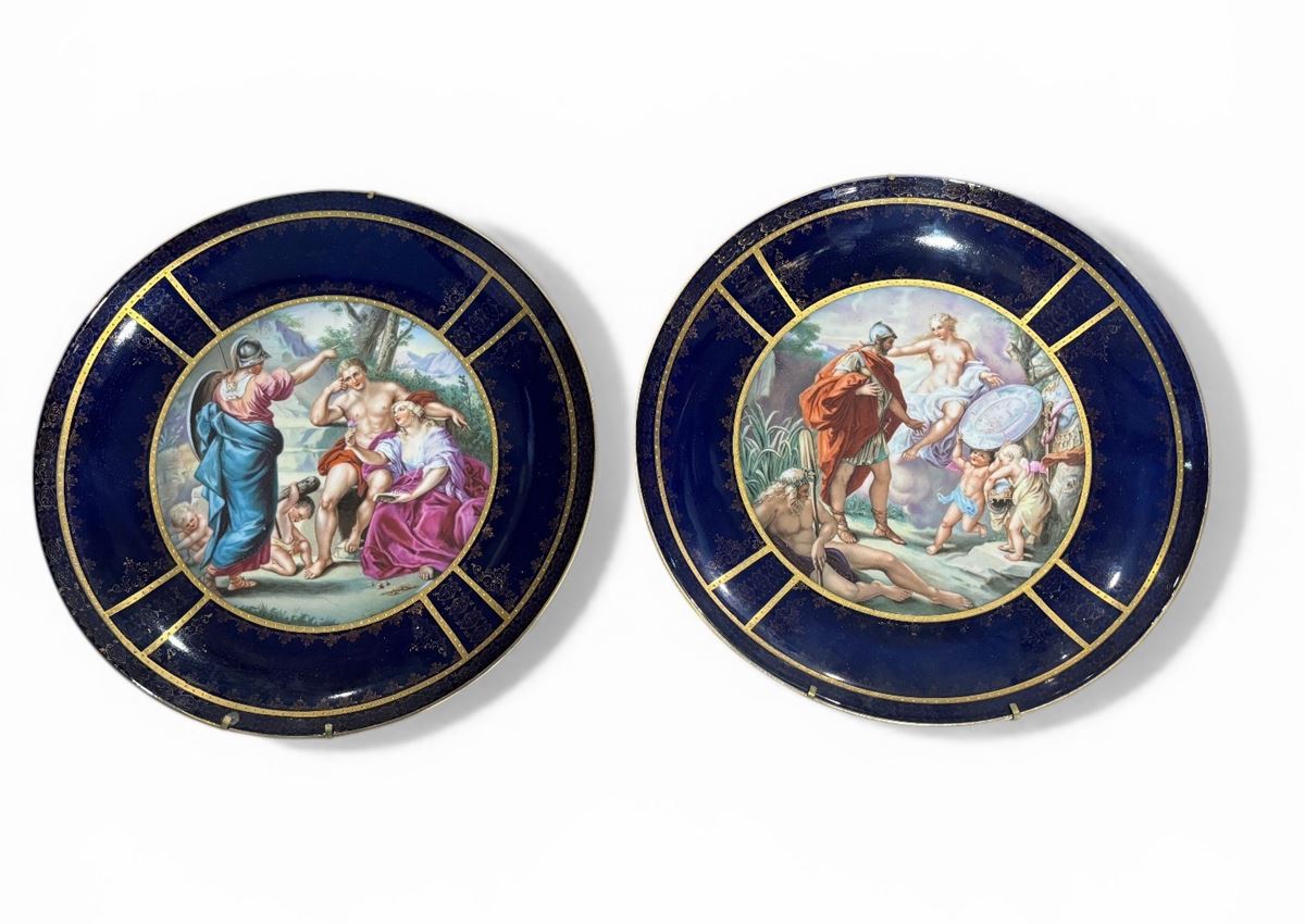Coppia di piatti decorativi in porcellana - Tesa blu cobalto con riserve e profili dorati, cavetto dipinto con scene di gusto classico. - d. 30,5 cm -