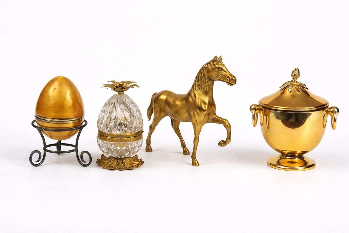 Lotto di oggetti decorativi di gusto eclettico - Composto da quattro elementi: contenitore o uovo decorativo in metallo dorato su supporto in ferro battuto; scatola o contenitore in cristallo molato con montatura in metallo dorato e presa a foggia floreale; statuetta raffigurante cavallo in metallo dorato, modellato a tutto tondo; vaso/coppa con coperchio in metallo dorato, dotato di anse laterali mobili e presa superiore sagomata. Cavallo (27 x 20 cm), secchiello (27 x 18 cm) e due uova (h. 12 cm). I lotti oggetto della presente asta sono ubicati presso un’abitazione privata sita in Roma.La partecipazione all’asta implica la piena accettazione della condizione secondo cui il ritiro dei beni aggiudicati sarà interamente a cura, rischio e spese dell’aggiudicatario.Resta inteso che eventuali operazioni di smontaggio, imballaggio, trasporto e ritiro dovranno essere organizzate direttamente dall’aggiudicatario.Si raccomanda pertanto di richiedere preventivamente tutte le informazioni necessarie, anche al fine di acquisire eventuali preventivi per il trasporto prima di formulare un’offerta. - - metallo dorato e ferro