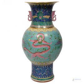 Vaso in porcellana con decori policromi raffiguranti draghi, Cina, XX secolo, altezza cm 93, (difetti)