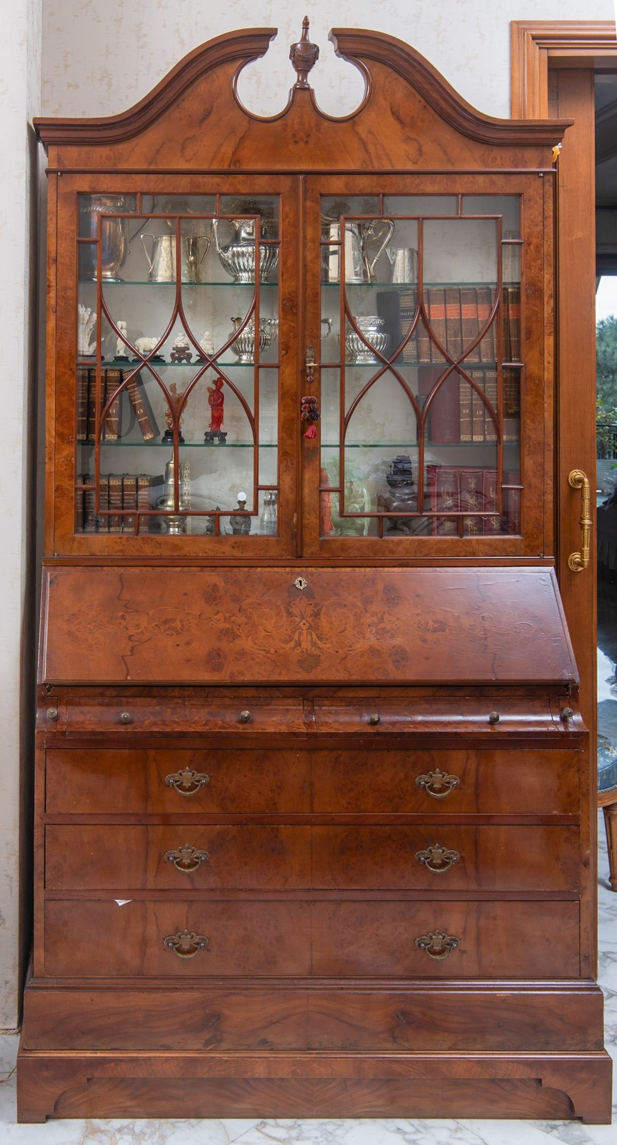 Trumeau in stile Giorgio III - Trumeau in stile inglese George III, realizzato in legno massello con impiallacciatura in radica (probabile noce o mogano). Il mobile presenta struttura a due corpi: parte inferiore con ribalta inclinata celante vano scrittoio e tre ampi cassetti sottostanti, dotati di maniglie in metallo; parte superiore costituita da alzata con due ante vetrate suddivise da eleganti montanti a disegno geometrico ogivale, contenenti ripiani interni. Il cappello è sagomato con cimasa mossa e pinnacolo centrale, mentre la ribalta è decorata da intarsio a motivi floreali stilizzati. I lotti oggetto della presente asta sono ubicati presso un’abitazione privata sita in Roma.La partecipazione all’asta implica la piena accettazione della condizione secondo cui il ritiro dei beni aggiudicati sarà interamente a cura, rischio e spese dell’aggiudicatario.Resta inteso che eventuali operazioni di smontaggio, imballaggio, trasporto e ritiro dovranno essere organizzate direttamente dall’aggiudicatario.Si raccomanda pertanto di richiedere preventivamente tutte le informazioni necessarie, anche al fine di acquisire eventuali preventivi per il trasporto prima di formulare un’offerta. - H. 210 x 110 x 40 cm -