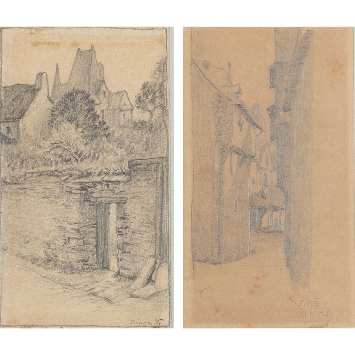 • Lot n° 0483 Elihu Vedder - "Scorci cittadini", coppia di disegni a matita e carboncino su carta, siglati in basso a destra, entro cornici - 15,5x9 cm. - 15,5x9 cm. -