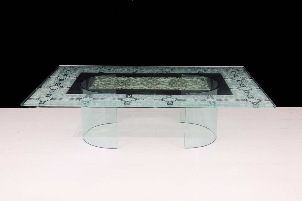 Tavolino in vetro - Tavolino in vetro riccamente molato e satinato a motivi floreali su base semicircolare. XX secolo. Difetti. - 39,5x150x99 cm ca. -