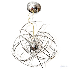 • Lot n° 0424 Lampadario in acciaio cromato mod. Atomo prod. Sforzin Illuminazione, diametro cm 51 circa, (usura del tempo, da revisionare)
