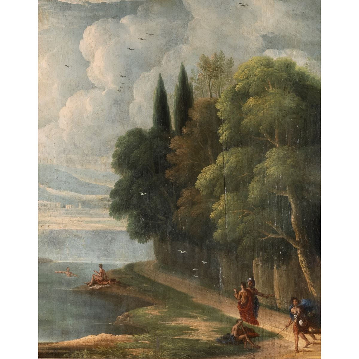 Scuola Italiana - "Paesaggio con figure", olio su tavola, entro cornice - 85x67 cm. -