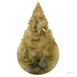 • Lot n° 0455 Placca sagomata in pietra saponaria con motivi a rilievo, XX secolo, cm 16,5x8,5