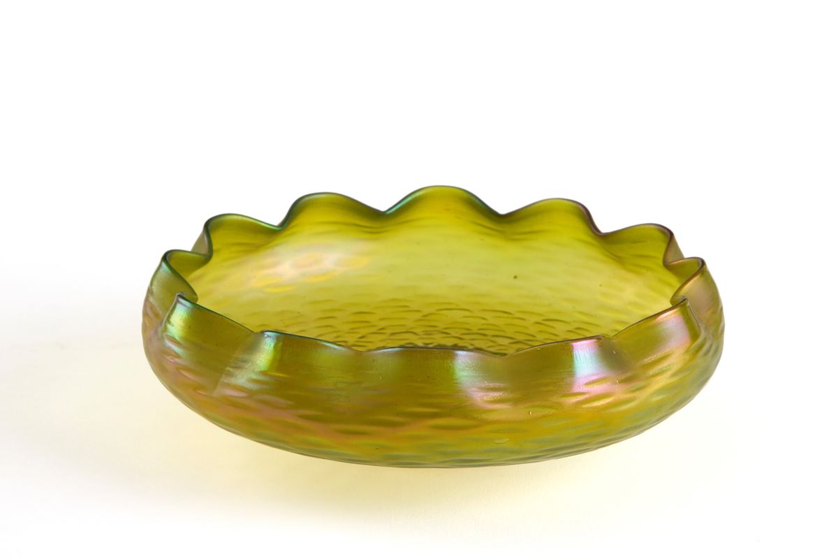 • Lot n° 0471 Alzatina. LOETZ (Attr.) - Alzatina in vetro iridescente nei toni del giallo. Manifattura LOETZ (Attr.). - 7x22 cm ca. -