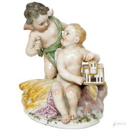 • Lot n° 0751 Amorini con uccellino e gabbietta, gruppo in porcellana policroma, Höchst, XIX secolo, cm h 15,5, (difetti, rotture)