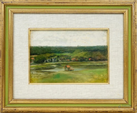 Paesaggio con case, olio su compensato, cm 16x23, XX secolo, entro cornice.
