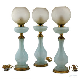 Lotto di tre lampade da tavolo in opalina turchese e vetro, XX secolo, altezza cm 47 (da revisionare, segni di usura del tempo)